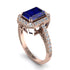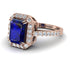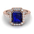 The Emerald Cut Sapphire Vintage-Inspired Engagement Ring is a striking blend of timeless elegance and intricate craftsmanship. The focal point of this exquisite ring is a dazzling emerald-cut Sapphire, renowned for its long, sleek lines and mirror-like facets that create a captivating hall of mirrors effect. This cut highlights the Sapphire's clarity and lends a sophisticated air to the overall design.Encircling the central emerald-cut Sapphire is a halo of smaller round Diamonds, meticulously set to enhance the ring's brilliance and add a touch of vintage glamour. These accent Diamonds amplify the sparkle and create a stunning contrast against the clean lines of the emerald cut.The band, crafted from luxurious 14K gold, features a delicate pave setting of round Diamonds that extends halfway down the shank. This intricate detailing adds to the ring's vintage charm and ensures it sparkles from every angle. The gold band is polished to a high sheen, providing a warm, rich backdrop that beautifully complements the bright gems.The gallery and undercarriage of the ring showcase intricate filigree work, a nod to antique jewelry design. This handcrafted detail adds depth and character, making the ring a true piece of art. Combining the emerald cut's modern elegance with the vintage-inspired setting creates a unique and timeless piece that is both classic and contemporary.The Emerald Cut Sapphire Vintage-Inspired Engagement Ring is perfect for those who appreciate the beauty of both past and present. Its sophisticated design and meticulous craftsmanship make it a stunning symbol of enduring love and commitment. This ring is an ideal choice for celebrating a significant milestone and promises to be cherished for generations to come.
