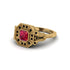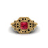 This handmade engagement ring showcases a stunning emerald cut Ruby at its center, framed by an octagonal halo adorned with milgrain detailing and smaller round Black Diamonds. This adds a luxurious touch, enhancing the vintage-inspired Art Deco design. Intricate detailing on the shank, featuring additional Black Diamonds, elevates the ring's elegance and sparkle. This exquisite piece is perfect for those who appreciate classic craftsmanship and modern sophistication.