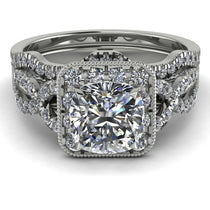 With its stunning design and charm, this Cushion Cut diamond Milgrain Bridal Set will definitely win you over. This mesmerizing Cushion Cut diamond Milgrain Bridal Set has an eye-catching cushion center stone and emerald second stones, complimented by gorgeous wedding ring with additional line of stones. You’ll be making the right choice with this enchanting Cushion Cut diamond Milgrain Bridal Set.
