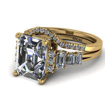 With this Emerald Cut diamond Bridal Set with Hidden Round Diamonds you can be confident and self-assured, as you’ll look stunning. This Emerald Cut diamond Bridal Set Hidden Round Diamonds has an diamond emerald cut center stone and three round and three princess stones to either of its sides, wedding ring adds a glamorous touch to the whole ring composition. With this bridal set you can be sure you won’t just be a part of the crowd.
