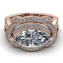 Find that beautiful and long lasting bridal set perfect just for you with this Milgrain Marquise diamond Bridal Set. This Milgrain Marquise diamond Bridal Set is an elaborate, interwoven split band, which has a marquise diamond. Rows of round stones cover the interwoven bands themselves. The wedding ring adds a beautiful touch to the bridal set composition. If you want a piece of jewelry that will be special and personal to you, you got it with this Milgrain Marquise diamond Bridal Set.