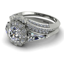 Discover the true beauty of jewelry with this elegant Vintage Hidden Halo diamond Bridal Set. This Vintage Hidden Halo diamond Bridal Set has a magnificent round center stones, lovely triangle stones next to the center one, and charming smaller round diamonds surrounding the center diamond and embellishing the widening band. The wedding rings adds a beautiful gorgeous touch to the look of the set. Feel special and beautiful with this charming Vintage Hidden Halo diamond Bridal Set on your finger.