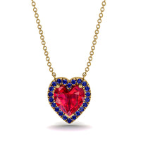 4.7Ct Ruby Halo Heart Necklace is a gorgeous heart necklace that will win every girl's heart. This luxurious necklace has an impressive 4.7 Carat heart-shaped Ruby in the middle, surrounded by 22 beautiful stones around it. It is a special gift for a very special girl!