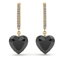 These heart black diamond hoop earrings promise to be the center of attention with their romantic brilliance. Fashioned in sleek, each hoop earring features a swoosh of shimmering white diamonds along the outer edge. A heart-shaped charm, lined with shimmering stones at the bottom that suspends from the hoop adding a radiant sparkle to these earrings. The hoop earrings secure comfortably with omega backings.