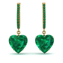 These heart Emerald hoop earrings promise to be the center of attention with their romantic brilliance. Fashioned in sleek, each hoop earring features a swoosh of shimmering white diamonds along the outer edge. A heart-shaped charm, lined with shimmering stones at the bottom that suspends from the hoop adding a radiant sparkle to these earrings. The hoop earrings secure comfortably with omega backings.