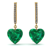 These heart Emerald hoop earrings promise to be the center of attention with their romantic brilliance. Fashioned in sleek, each hoop earring features a swoosh of shimmering white diamonds along the outer edge. A heart-shaped charm, lined with shimmering stones at the bottom that suspends from the hoop adding a radiant sparkle to these earrings. The hoop earrings secure comfortably with omega backings.