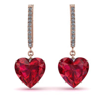 These heart Ruby hoop earrings promise to be the center of attention with their romantic brilliance. Fashioned in sleek, each hoop earring features a swoosh of shimmering white diamonds along the outer edge. A heart-shaped charm, lined with shimmering stones at the bottom that suspends from the hoop adding a radiant sparkle to these earrings. The hoop earrings secure comfortably with omega backings.