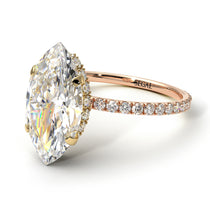 With a timeless style and a luxurious look, this Hidden Halo Marquise Diamond Engagement Ring is the most fashionable thing you can wear. This Hidden Halo Marquise Diamond Engagement Ring is a thin band with a marquise diamond center stone and round stones covering the rest of the band.