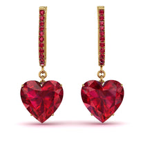 These heart Ruby hoop earrings promise to be the center of attention with their romantic brilliance. Fashioned in sleek, each hoop earring features a swoosh of shimmering white diamonds along the outer edge. A heart-shaped charm, lined with shimmering stones at the bottom that suspends from the hoop adding a radiant sparkle to these earrings. The hoop earrings secure comfortably with omega backings.