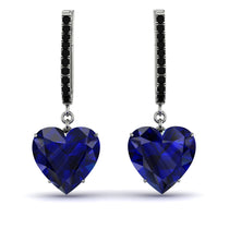 These heart Sapphire hoop earrings promise to be the center of attention with their romantic brilliance. Fashioned in sleek, each hoop earring features a swoosh of shimmering white diamonds along the outer edge. A heart-shaped charm, lined with shimmering stones at the bottom that suspends from the hoop adding a radiant sparkle to these earrings. The hoop earrings secure comfortably with omega backings.