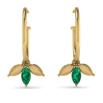 So stunning, these petite Emerald J-hoop earrings are a sparkling addition to her wardrobe. Crafted in gold, each earring features a pretty bowed vine design touched with shimmering marquise center stone Emerald in the center with 2 gold leaves around it. These post earrings secure comfortably with friction backs.
