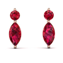 This beaming set of earrings will have you mesmerized by its whimsical design. A stunning bezel set round cut Ruby at the top with a heart in the center that attaches to drop marquise Ruby set with bezel setting makes it a perfect gift. These earrings come with a friction back.