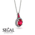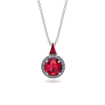With eternal class and a luxurious appearance, this Hidden Halo Ruby Necklace is the most stylish thing you can wear. This necklace has a round center Ruby surrounded by smaller round stones, as well as a triangle cut stone on top of them.