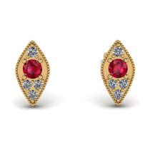 Perfectly petite, these vintage-inspired Ruby stud earrings are an adorable look she'll never want to take off. Crafted in marquise shape gold, each anytime earring showcases a sparkling in an intricate milgrain-lined bezel setting. Captivating Ruby and a bright polished shine, these post earrings secure comfortably with friction backs.