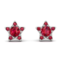 Glow in our sparkly star earrings. The adorable star studs light up with Ruby in the center with five different Ruby enhancing the five-point of the star thereby illuminating the look of the wearer. These post earrings secure comfortably with friction backs.