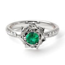 My ‘Elena’ Rose Emerald ring brings the beauty of Flowers Emerald and Diamonds together in one exquisite and comfortable ring. Nestled in the center of the flower is a single Natural Emerald, flanked on either side by 5 smaller natural diamonds. Set in solid 14K White gold, this vintage antique engagement ring is sure to make her throw her arms around you, give you a huge kiss and say yes!