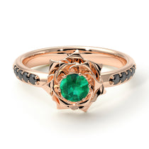 My ‘Elena’ Rose Emerald ring brings the beauty of Flowers Emerald and Black Diamonds together in one exquisite and comfortable ring. Nestled in the center of the flower is a single Natural Emerald, flanked on either side by 5 smaller natural black diamonds. Set in solid 14K Rose gold, this vintage antique engagement ring is sure to make her throw her arms around you, give you a huge kiss and say yes!