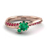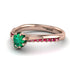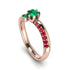 This delicate Emerald engagement ring is a timeless classic of jewelry reinvented in modern forms. This ring is a classic round 0.25 carat Emerald engagement ring with an additional stone in the center and the ring's sides.