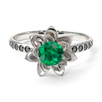 White Gold 0.5 Carat Round Cut Emerald Pave Flower Engagement Ring - Her name is simply... 'Lotus'. This Beautiful unique Gold Lotus flower engagement ring is one of my personal favorites and best creations. The Lotus flower is considered by many cultures to be a symbol of Rebirth, Purity and exquisite unparalleled beauty. There is no doubt this ring is the perfect match for those special and unique women out there.