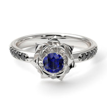 My ‘Elena’ Rose Sapphire ring brings the beauty of Flowers Sapphire and Black Diamonds together in one exquisite and comfortable ring. Nestled in the center of the flower is a single Natural Sapphire, flanked on either side by 5 smaller natural black diamonds. Set in solid 14K White gold, this vintage antique engagement ring is sure to make her throw her arms around you, give you a huge kiss and say yes!