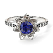 White Gold 0.5 Carat Round Cut Sapphire Pave Flower Engagement Ring - Her name is simply... 'Lotus'. This Beautiful unique Gold Lotus flower engagement ring is one of my personal favorites and best creations. The Lotus flower is considered by many cultures to be a symbol of Rebirth, Purity and exquisite unparalleled beauty. There is no doubt this ring is the perfect match for those special and unique women out there.