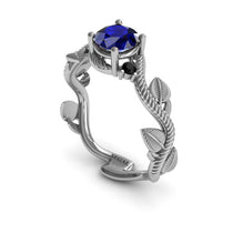 White Gold 0.84 Carat Round Cut Sapphire Nature Leaf Engagement Ring - If she loves Mother Nature, she's going to love our 'Allison' Leaf engagement ring. This Unique Engagement Ring is set in sparkling solid Gold and decorated with Leaves and Branches to create a beautiful unique ring. Set with a large 6mm center stone and smaller side stones, the result is a perfect engagement ring to make her say yes.