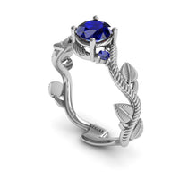 White Gold 0.84 Carat Round Cut Sapphire Nature Leaf Engagement Ring - If she loves Mother Nature, she's going to love our 'Allison' Leaf engagement ring. This Unique Engagement Ring is set in sparkling solid Gold and decorated with Leaves and Branches to create a beautiful unique ring. Set with a large 6mm center stone and smaller side stones, the result is a perfect engagement ring to make her say yes.