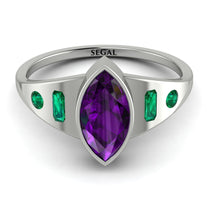 If you something both original and modern, you’ll get it with this captivating Marquise Bezel Amethyst Ring. This Marquise Bezel Amethyst Ring is a round band with a marquise stone in the center, an emerald shaped ring to either side of it, and a round shaped stones in either side of those. When you want to stand out and be noticeable, this Marquise Bezel Amethyst Ring is for you.