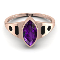 If you something both original and modern, you’ll get it with this captivating Marquise Bezel Amethyst Ring. This Marquise Bezel Amethyst Ring is a round band with a marquise stone in the center, an emerald shaped ring to either side of it, and a round shaped stones in either side of those. When you want to stand out and be noticeable, this Marquise Bezel Amethyst Ring is for you.