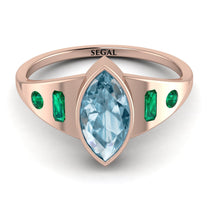 If you something both original and modern, you’ll get it with this captivating Marquise Bezel Aquamarine Ring. This Marquise Bezel Aquamarine Ring is a round band with a marquise stone in the center, an emerald shaped ring to either side of it, and a round shaped stones in either side of those. When you want to stand out and be noticeable, this Marquise Bezel Aquamarine Ring is for you.