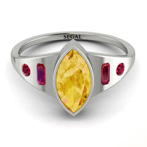 If you something both original and modern, you’ll get it with this captivating Marquise Bezel Citrine Ring. This Marquise Bezel Citrine Ring is a round band with a marquise stone in the center, an emerald shaped ring to either side of it, and a round shaped stones in either side of those. When you want to stand out and be noticeable, this Marquise Bezel Citrine Ring is for you.
