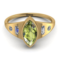 If you something both original and modern, you’ll get it with this captivating Marquise Bezel Peridot Ring. This Marquise Bezel Peridot Ring is a round band with a marquise stone in the center, an emerald shaped ring to either side of it, and a round shaped stones in either side of those. When you want to stand out and be noticeable, this Marquise Bezel Peridot Ring is for you.