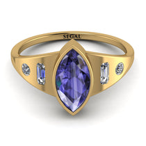 If you something both original and modern, you’ll get it with this captivating Marquise Bezel Tanzanite Ring. This Marquise Bezel Tanzanite Ring is a round band with a marquise stone in the center, an emerald shaped ring to either side of it, and a round shaped stones in either side of those. When you want to stand out and be noticeable, this Marquise Bezel Tanzanite Ring is for you.
