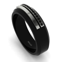 Wedding band that will make him impressed. Beautiful and stylish black titanium ring decorated with two golden lines and set of 13 top-notch black diamonds. A unique gift that he will love to wear every day of his life.