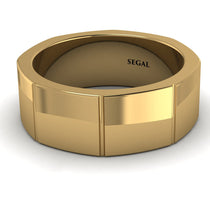 Declare your love for him with a striking wedding band from Segal Jewelers. Fashioned in gold, this 8.0mm wide band features a unique brick-like pattern. The signature comfort fit is a thoughtful touch. Custom made to fit his ring size. Designed for a modern man on the go!