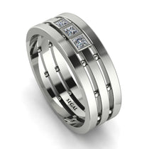 This stunning ring for him displays three rows with 3 bezel princess cut diamond set in gold as its eye-catching centerpiece. A style he'll treasure, this ring glistens diamond and a bright polished shine. Custom-made to fit his ring size.