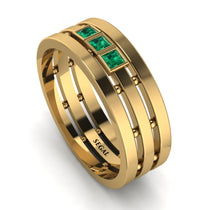 This stunning ring for him displays three rows with 3 bezel princess cut Emerald set in gold as its eye-catching centerpiece. A style he'll treasure, this ring glistens Emerald and a bright polished shine. Custom-made to fit his ring size.