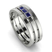 This stunning ring for him displays three rows with 3 bezel princess cut Sapphire set in gold as its eye-catching centerpiece. A style he'll treasure, this ring glistens Sapphire and a bright polished shine. Custom-made to fit his ring size.