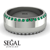 He's the man you can't wait to spend forever loving. On your wedding day, give him the perfect band as a symbol of your matrimony and commitment. Set gold, this handsome style lights up with round Emerald lining the edges of the band.
