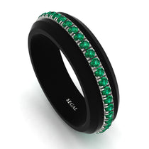 This cool & classic men's wedding band features round Emerald wrapping the entire ring. Comfort fit, and black titanium materials. Comfort Fit rings have a rounded interior specifically designed for the most comfortable all-day wear. The contemporary metal Black Titanium offers strength and durability to every design.