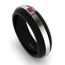 Unique black wedding band for man, made of highly-durable black titanium, covered with golden line and crowned with beautiful 0.05Ct Ruby. The ring, that he will love to wear anytime, anywhere.
