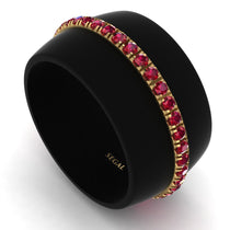 Designed for a modern man on the go, created from high-performance metals that are durable, comfortable and fashionable. This men's wedding band features Ruby studded in the center and is fashioned in black titanium and is 6.0mm wide. Custom-made to fit his ring size. Black Titanium rings cannot be resized after purchase. The inside of the band is rounded for comfort.