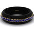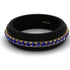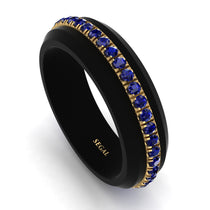 This cool & classic men's wedding band features round Sapphire wrapping the entire ring. Comfort fit, and black titanium materials. Comfort Fit rings have a rounded interior specifically designed for the most comfortable all-day wear. The contemporary metal Black Titanium offers strength and durability to every design.