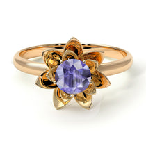 The Lotus Flower Solitaire Tanzanite ring is a breathtaking piece of jewelry designed to evoke the beauty and purity of a lotus flower. Crafted in radiant yellow gold, this handmade ring features a delicate floral motif and intricately shaped petals, cradling a brilliant 0.5-carat round tanzanite at its center. The tanzanite's sparkle and the ring's elegant design make it a perfect choice for an engagement, an anniversary, or a meaningful gift. This unique and sophisticated ring combines timeless craftsmanship with nature-inspired beauty.