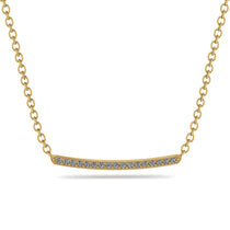 Simple yet stylish, this trend setting white diamond bar necklace dazzles in the gold setting. This slightly curved bar necklace features pave-set 17 round diamond to show them in their very best light. Attached to this matching gold chain, making it a perfect adornment for layering.