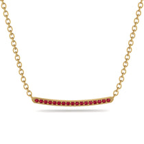 Simple yet stylish, this trend setting white diamond bar necklace dazzles in the gold setting. This slightly curved bar necklace features pave-set 17 round Ruby to show them in their very best light. Attached to this matching gold chain, making it a perfect adornment for layering.