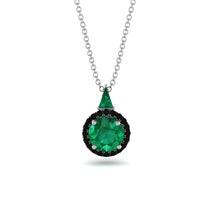 With eternal class and a luxurious appearance, this Hidden Halo Emerald Necklace is the most stylish thing you can wear. This necklace has a round center Emerald surrounded by smaller round stones, as well as a triangle cut stone on top of them.