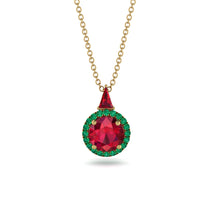 With eternal class and a luxurious appearance, this Hidden Halo Ruby Necklace is the most stylish thing you can wear. This necklace has a round center Ruby surrounded by smaller round stones, as well as a triangle cut stone on top of them.