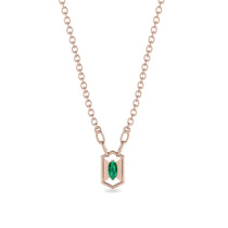 A contemporary look that pairs well with most anything, this subtle Emerald pendant is sure to become her favorite go-to accessory. Appeal to her modern taste with this alluring pendant, featuring an elongated hexagon frame with 0.06ct oval shaped Emerald in the center that enhances the classic. Buffed to a brilliant luster and sure to be instantly treasured, this meaningful pendant suspends along an 18.0-inch link chain that secures with a spring-ring clasp.