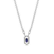 A contemporary look that pairs well with most anything, this subtle Sapphire pendant is sure to become her favorite go-to accessory. Appeal to her modern taste with this alluring pendant, featuring an elongated hexagon frame with 0.06ct oval shaped Sapphire in the center that enhances the classic. Buffed to a brilliant luster and sure to be instantly treasured, this meaningful pendant suspends along an 18.0-inch link chain that secures with a spring-ring clasp.